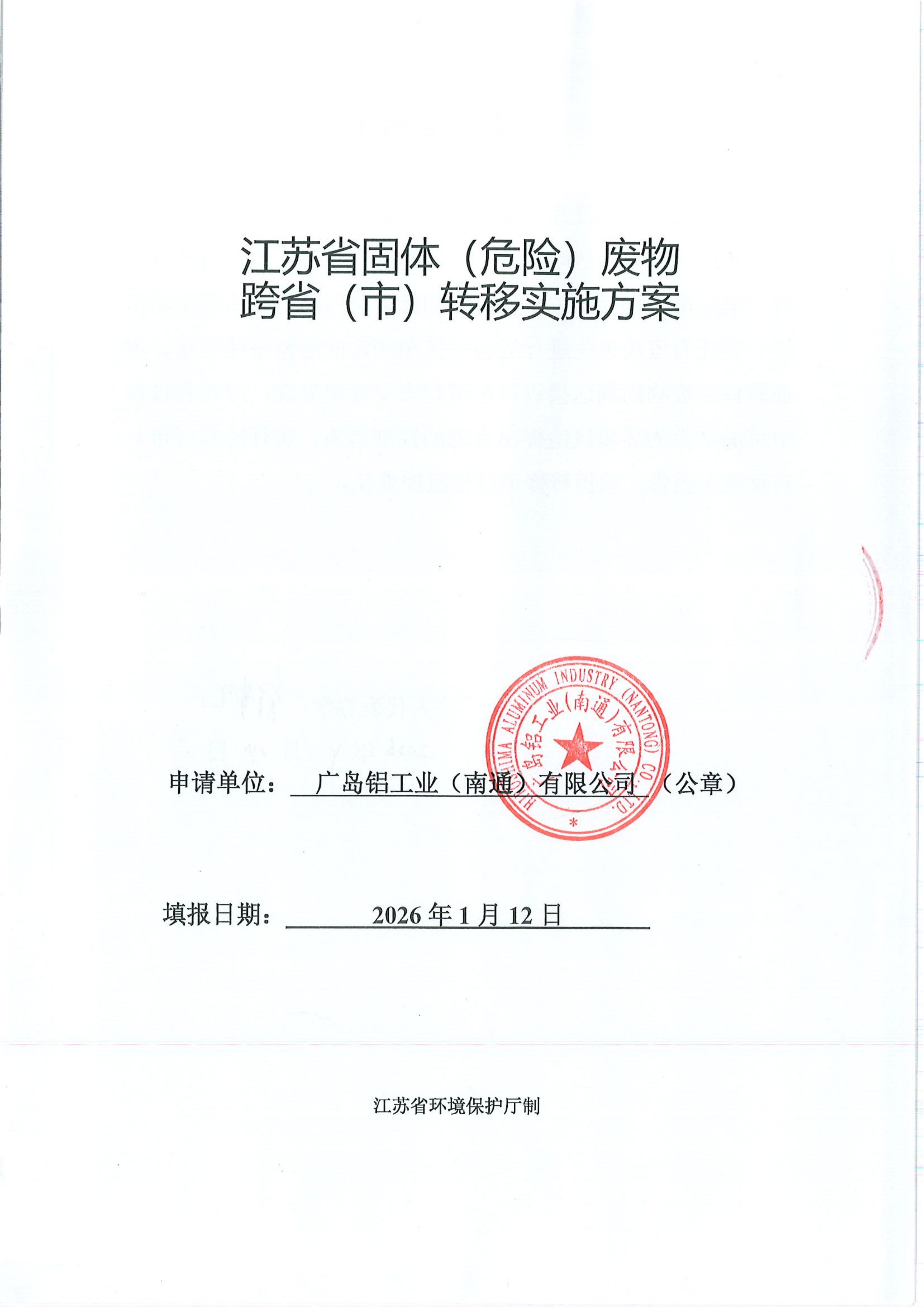 廣島鋁工業(yè)(南通)有限公司固體(危險廢物)廢物跨省轉(zhuǎn)移實施方案(2026年計劃)